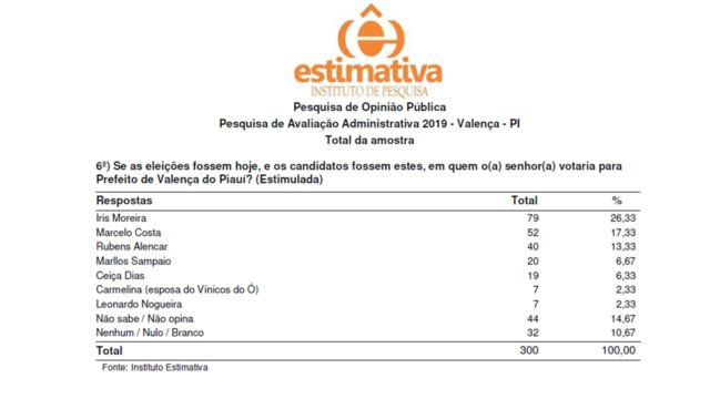 O Instituto de Pesquisa Estimativa de Teresina aferiu a intenção de votos para a sucessão municipal em Valença do Piauí com vistas às eleições de 04 de outubro de 2020.