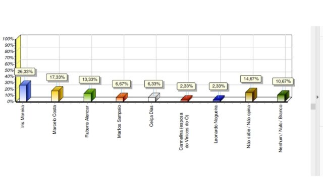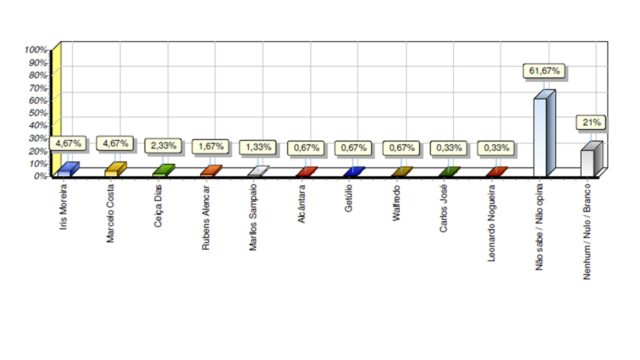 Veja os números: Iris Moreira 4,67%, Marcelo Costa 4,67%, Ceiça Dias 2,33%, Rubens Alencar 1,67%, Marllos Sampaio 1,33%, Dr. Alcântara 0,67%, Getúlio Gomes 0,67%, Walfredo Filho 0,67%, Carlos José 0,33%, Leonardo Nogueira 0,33%, não sabe/não opina 61,67%, nenhum/nulo/branco 21,00%.
