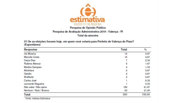 O levantamento foi feito com 300 eleitores entre os dias 01 e 02 de agosto na cidade e interior de Valença. De acordo com o Instituto Estimativa, o levantamento apresenta uma confiabilidade de 95% e uma margem de erro de 5,6% e 5% de significância.