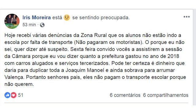 A vereadora Iris Moreira (Progressistas), disse nas redes sociais nessa terça-feira (23), que vem recebendo denúncias de que alunos da zona rural de Valença não estão indo à escola por falta de transporte escolar.