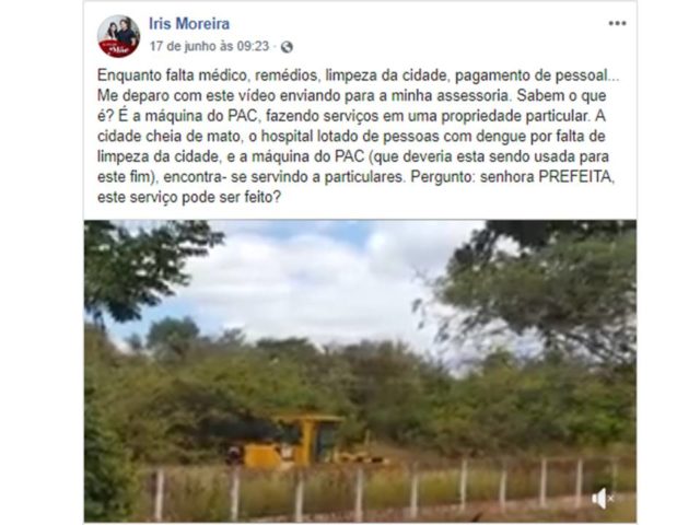 “Enquanto falta médico, remédios, limpeza da cidade, pagamento de pessoal. Me deparo com este vídeo. Sabem o que é? É a máquina do PAC, fazendo serviços em uma propriedade particular. A cidade cheia de mato, o hospital lotado de pessoas com dengue por falta de limpeza da cidade, e a máquina do PAC (que deveria esta sendo usada para este fim), encontra- se servindo a particulares. Pergunto: senhora PREFEITA, este serviço pode ser feito?” indagou Iris Moreira. O local e o nome do beneficiado não foi revelado na postagem. Assista ao vídeo. A prefeita Ceiça Dias ainda não se manifestou sobre a denuncia da vereadora.