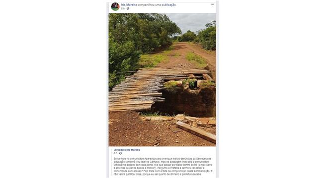 A vereadora Iris Moreira publicou em sua rede social uma foto que mostra a precariedade da ponte que dá acesso a comunidade Oiticica em Valença. De acordo íris Moreira, ela estava se deslocando para a comunidade Aparecida para averiguar algumas denuncias que chegaram a seu gabinete em relação a Secretaria de Educação quando foi surpreendida pela precariedade da ponte.