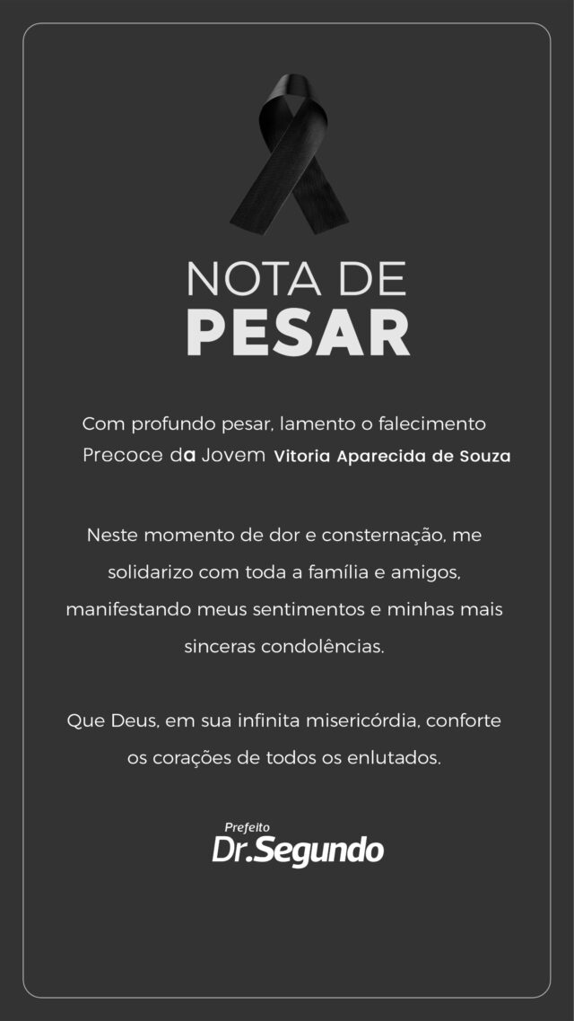 “Com profundo pesar, lamento o falecimento precoce da jovem Vitória Aparecida de Souza. Neste momento de dor e consternação, me solidarizo com toda a família e amigos, manifestando meus sentimentos e minhas mais sinceras condolências. Que Deus, em sua infinita misericórdia, conforte os corações de todos os enlutados”, declarou.