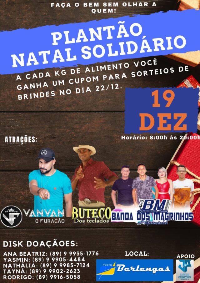 No próximo sábado (19/12) acontecerá, das 08h às 20h, no Posto Berlengas, um plantão de arrecadação com direito a atrações musicais que serão transmitidas através de uma live. As atrações confirmadas são: Vanvan, o furacão, Buteco dos Teclados e Banda dos Magrinhos.