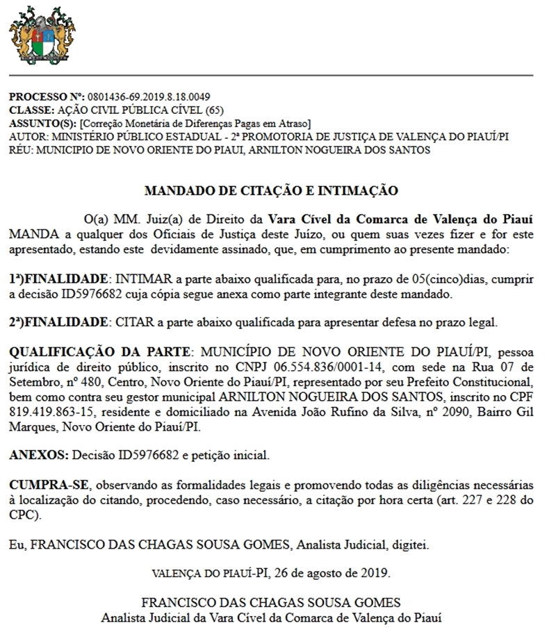 O juiz da Comarca de Valença, Dr. Juscelino Norberto expediu nessa segunda-feira, 26 de agosto mandato de citação e intimação para que o prefeito de Novo Oriente Arnilton Nogueira cumpra num prazo de 05 dias, decisão liminar determinado que regularize o pagamento dos servidores efetivos e contratados, bem como não atrase mais as remunerações.