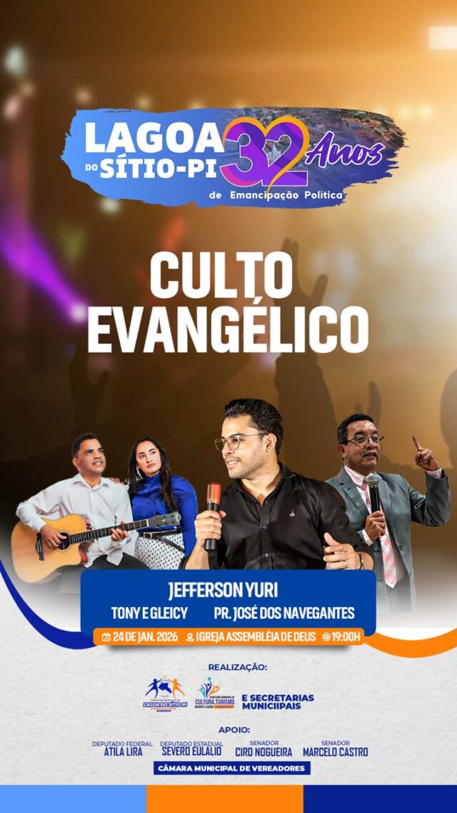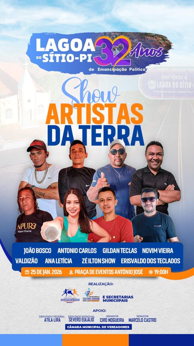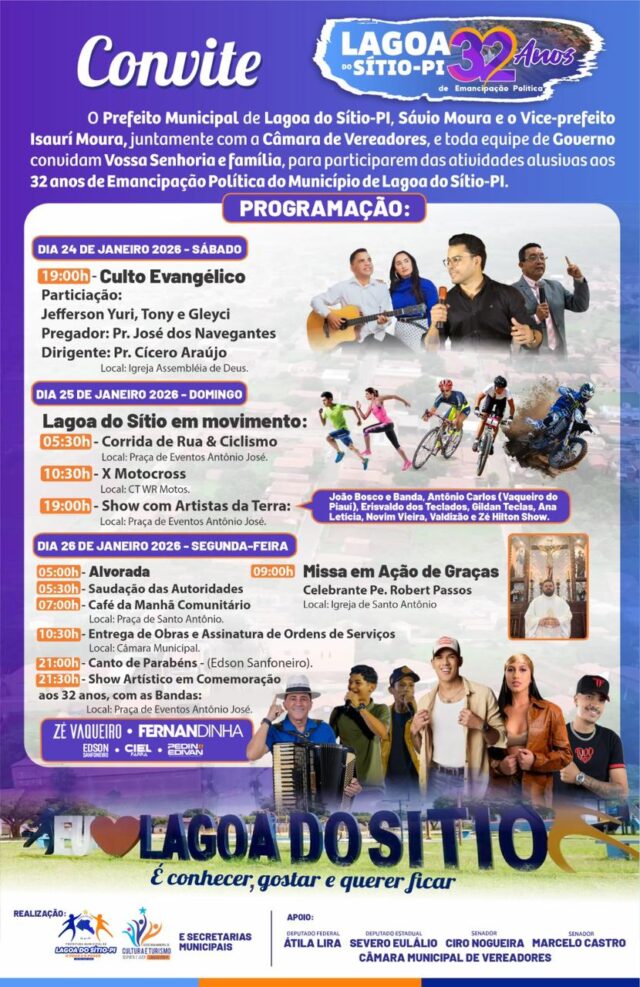Encerrando as comemorações, a festa continua à noite com o tradicional canto de parabéns e uma grande programação musical em celebração aos 32 anos de Lagoa do Sítio. No palco, se apresentam o cantor Zé Vaqueiro, atração nacional, além de Fernandinha, Edson Sanfoneiro, Ciel Farra e a dupla Pedin e Edvan, prometendo animar o público em um momento de confraternização e celebração da história do município.