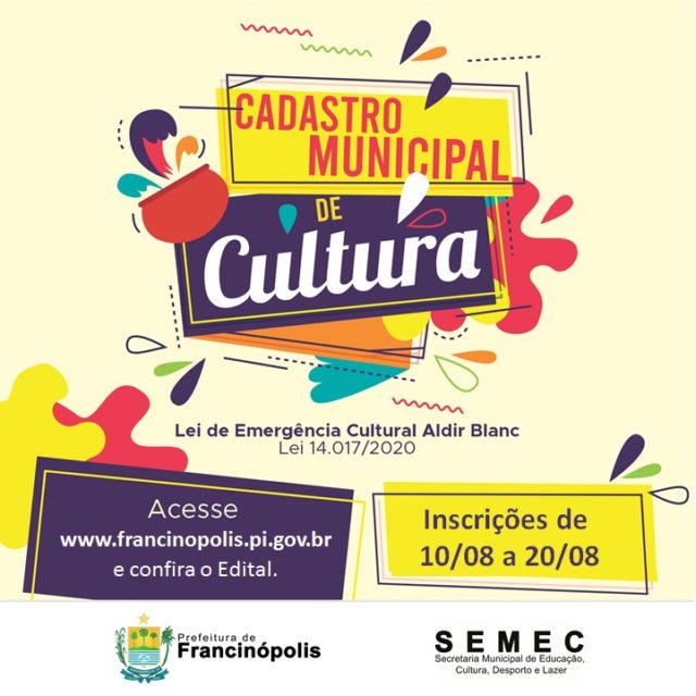 A Prefeitura de Francinópolis, por intermédio da Secretária Municipal de Educação, Cultura, Desporto e Lazer de Francinópolis-PI – SEMEC, divulgou nessa quinta-feira, 30 de junho, o Edital 01/2020 que trata sobre a abertura do cadastro de profissionais do setor cultural e organizações culturais em diversos segmentos artísticos e culturais que participam do setor artístico e cultural de Francinópolis.