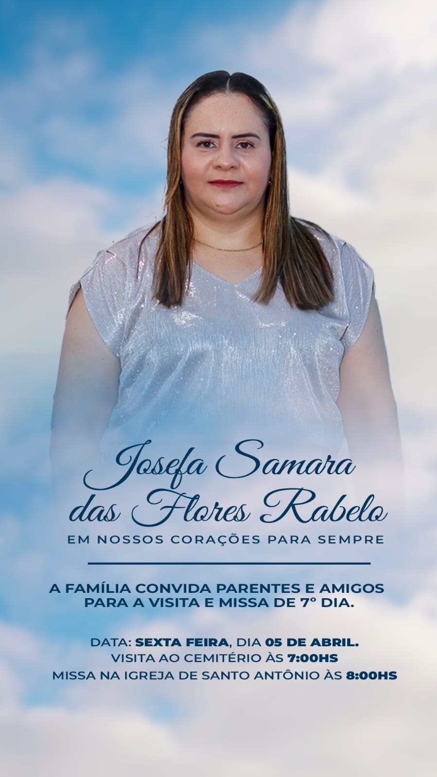 Será celebrada nesta sexta-feira (5), na Igreja de Santo Antônio em Lagoa do Sitio, a missa de sétimo dia em memória do falecimento de Josefa Samara das Flores Rabelo que faleceu nesta sexta-feira (29), depois de se submeter a uma cirurgia no Hospital Regional Eustáquio Portela em Valença do Piaui. De acordo com o convite às 07h haverá visitação ao cemitério e às 08h acontecerá a Santa Missa.