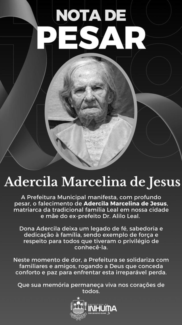 Faleceu nesta quarta-feira, 15 de abril, em Teresina, aos 99 anos, a senhora Adercila Marcelina de Jesus, matriarca da tradicional família Leal do município de Inhuma. Ela era mãe do ex-prefeito de Inhuma Alilo Leal e da professora e ex-reitora da Universidade Estadual do Piauí, Adamir Leal. O casal teve ao todo sete filho sendo 03 homens e 4 mulheres Adamir, Adetiza, Anatercia, Anatalia, Alilo Leal, Francisco de Assis e Francisco das Chagas “in memorian”.
