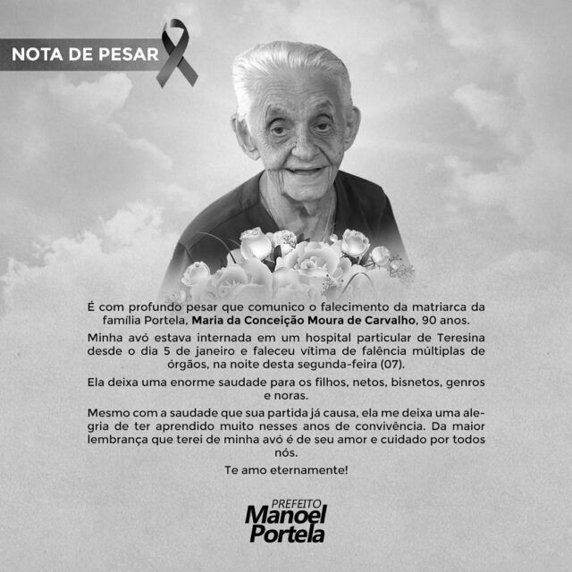 O prefeito de Aroazes, Manoel Portela Neto usou as redes sociais para informar e lamentar a morte da matriarca da Família Portela, a senhora Maria da Conceição Moura de Carvalho de 90 anos.