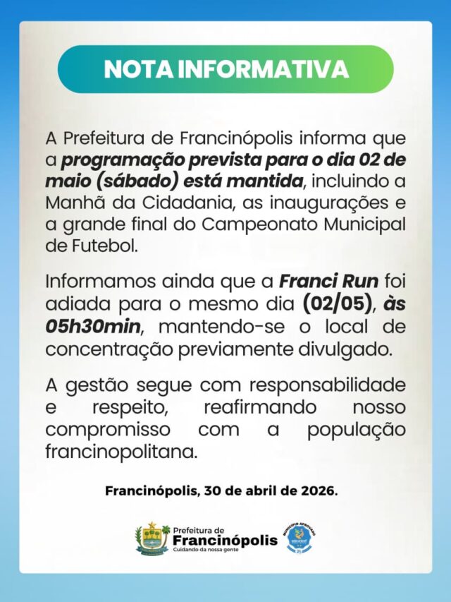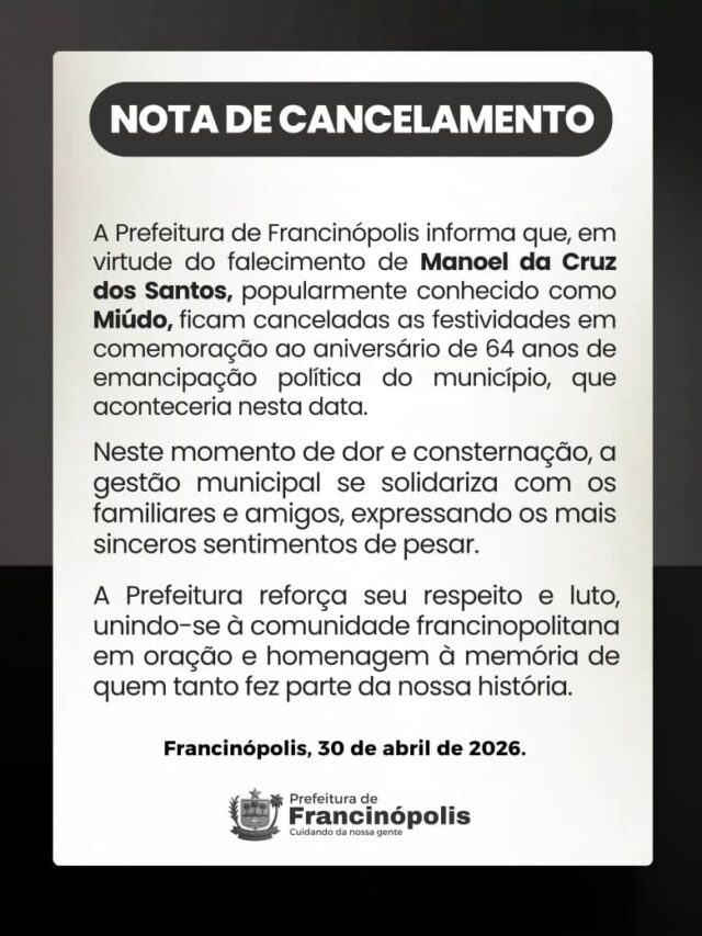 A Prefeitura Municipal de Francinópolis emitiu uma nota oficial nesta quarta-feira, 30 de abril de 2026, informando o cancelamento da programação festiva alusiva aos 64 anos de emancipação política do município, que aconteceria nesta quinta-feira (30).
