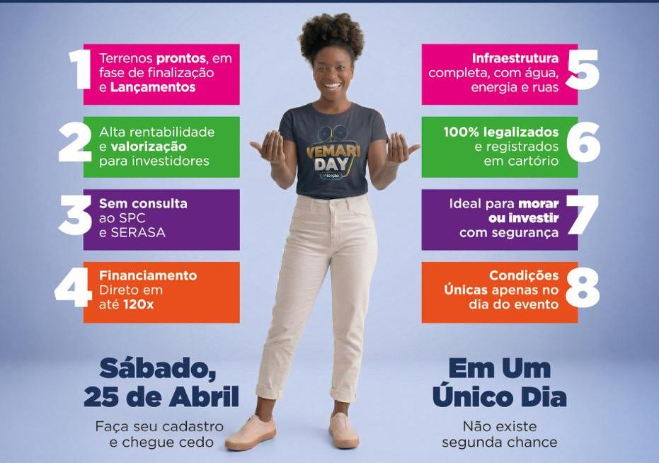 A expectativa é de que o Vemari Day reúna um grande número de interessados ao longo do sábado, consolidando-se como uma das maiores ações de venda de terrenos já realizadas na região, especialmente pelas condições facilitadas de pagamento, com parcelas a partir de R$ 37 reais por mês.