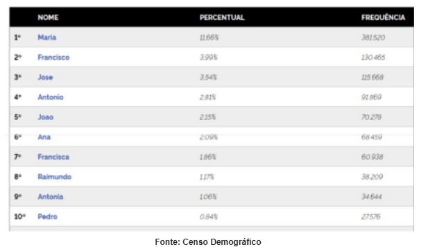 Entre os dez nomes mais comuns no estado, considerando homens e mulheres, o destaque é para Maria, com 381.520 registros — o equivalente a 11,66% da população piauiense. Em seguida vêm Francisco (3,99%), José (3,54%), Antônio (2,81%), João (2,15%), Ana (2,09%), Francisca (1,86%), Raimundo (1,17%), Antônia (1,06%) e Pedro (0,84%).