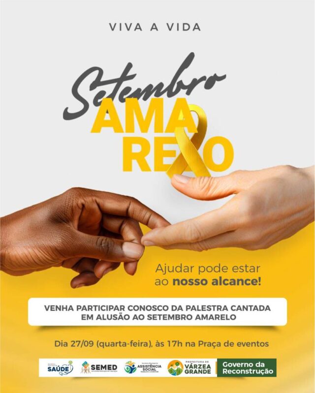 Nesta quarta-feira (27), a Prefeitura de Várzea Grande, por meio das secretarias de Assistência Social, Educação e Saúde realizará uma palestra cantada com Christiany Barros e Kariny Santos em alusão a campanha Setembro Amarelo, na Praça de Eventos a partir das 17h. O evento gratuito chama a atenção das pessoas para refletir sobre o tema desse ano que é “Se precisar, peça ajuda!”.