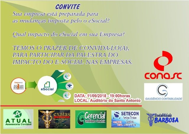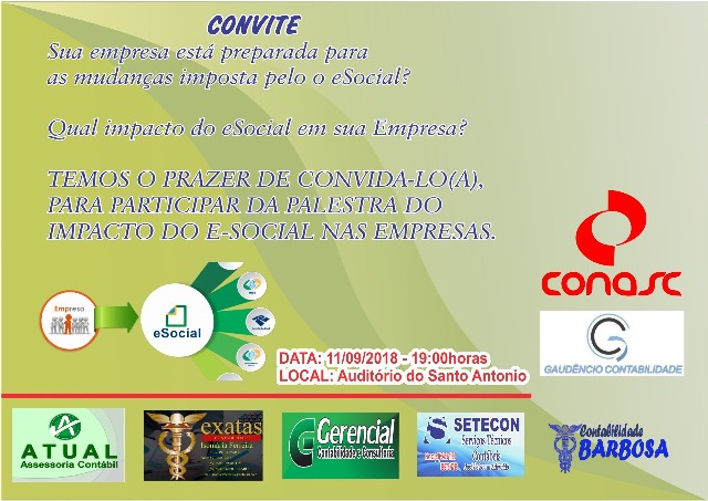 Acontecerá nessa terça-feira, 11 de setembro uma palestra sobre o Impacto do Sistema de Escrituração Fiscal Digital das Obrigações Fiscais, Previdenciárias e Trabalhistas (eSocial) nas empresas. As palestras serão ministradas no auditório do Colégio Santo Antônio a partir das 19h.