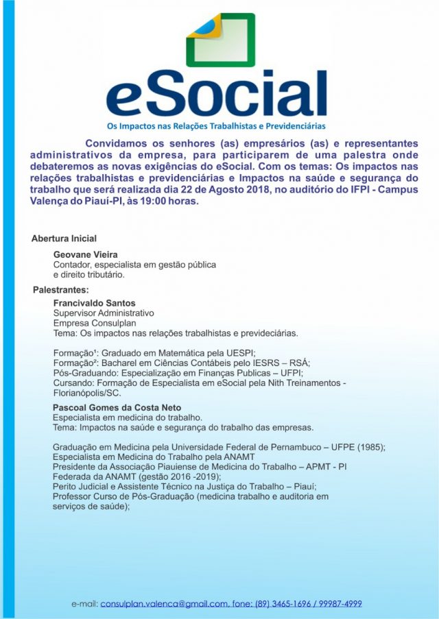 Preocupado com essas mudanças e com o propósito de contribuir com a organização das empresas a CONSULPLAN estará promovendo no dia 22 de agosto de 2018, às 19:00hrs no auditório do IFPI em Valença-PI uma palestra com a seguinte temática: