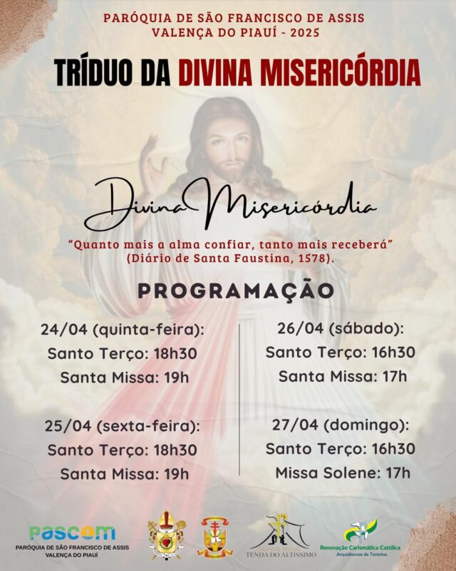 A Paróquia de São Francisco de Assis, em Valença do Piauí, promoverá entre os dias 24 e 27 de abril o Tríduo da Misericórdia, com o tema “Quanto mais a alma confiar, tanto mais receberá” (Diário de Santa Faustina, 1578).