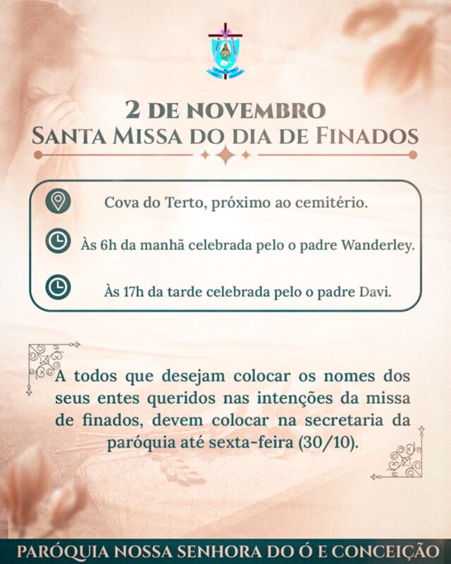 As Paróquias de Nossa Senhora do Ó e Conceição e São Francisco de Assis, em Valença do Piauí, divulgaram a programação das celebrações do Dia de Finados, data dedicada à memória e oração pelos entes queridos que já partiram.