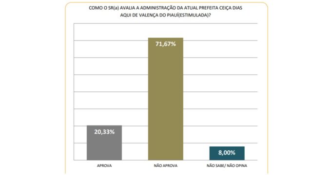 Quando foi perguntado “Como o Sr (a) avalia a administração da atual prefeita Ceiça Dias, os números foram os seguintes: 71,67% não aprova, 20,33% aprova, não sabe não opina 08,00%.