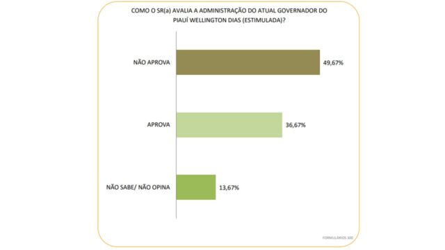 Quando o avaliado é o governador Wellington Dias, os números são os seguintes: Não aprova somam 49,67%, aprova 36,67%, não sabe não opina 13,67%.
