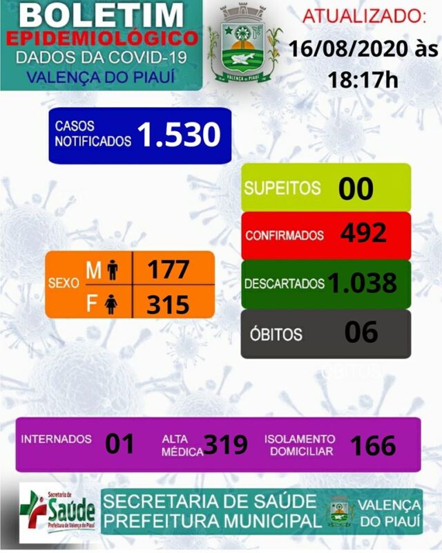 O Piauí possui 66.315 casos confirmados do novo coronavírus e 1.619 óbitos registrados pela doença, em 147 municípios. Deste total, morreram 944 homens e 675 mulheres.