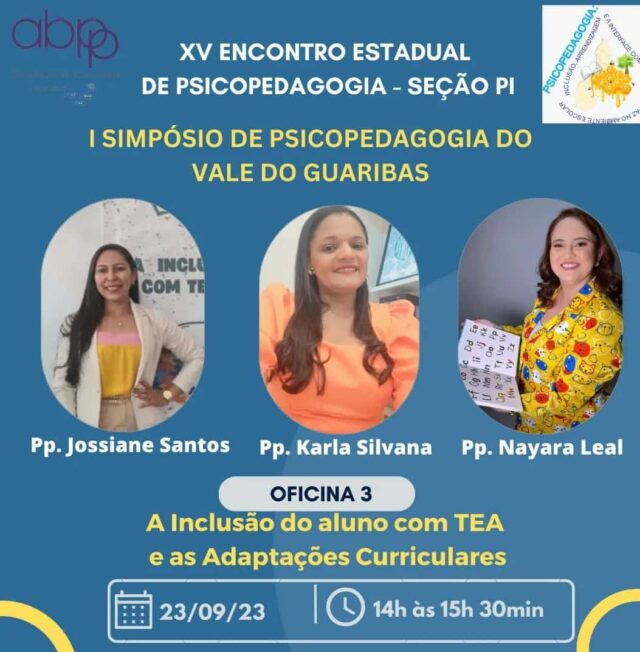 Com uma vasta programação, o XI Encontro Estadual de Psicopedagogia está trazendo para o público participantes grandes nomes da área, por meio de palestras, mesa de debate e oficinas, sendo uma delas com o tema: Inclusão do Aluno com TEA e Adaptações Curriculares, ministradas pelas psicopedagogas da região valenciana, sendo a psicopedagoga Jossiane Soares de Valença, Karla Silvana do município da Inhuma e Nayara Leal de Ipiranga.