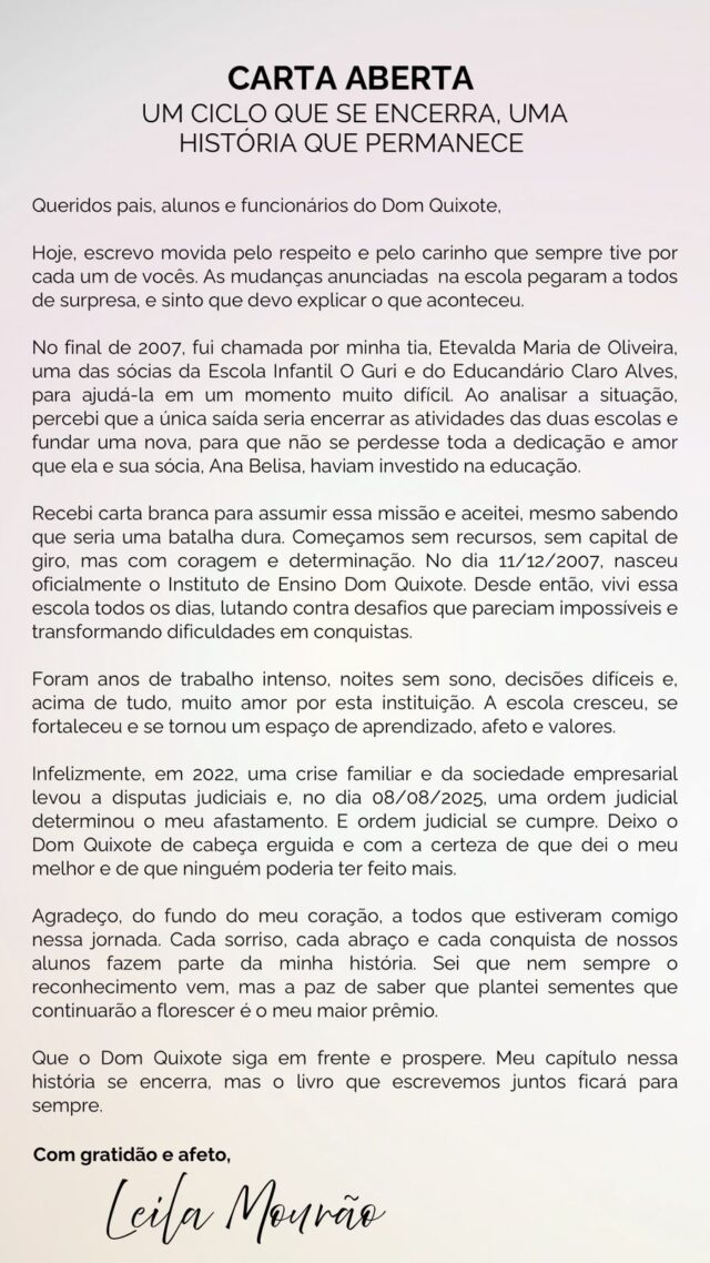 Após confirmar sua saída da direção financeira do Instituto de Ensino Dom Quixote, Leila Mourão publicou uma carta aberta dirigida a pais, alunos e funcionários, agradecendo a parceria dos últimos anos, relatando o trabalho realizado e explicando os motivos de seu afastamento.
