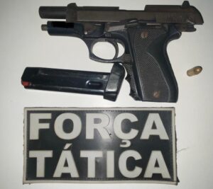 As equipes do policiamento ordinário e Força Tática apreenderam na residência um revólver calibre 32 municiado e vários projéteis dos calibres 22, 32, 36, .40, 44 e um projétil de munição calibre.50.