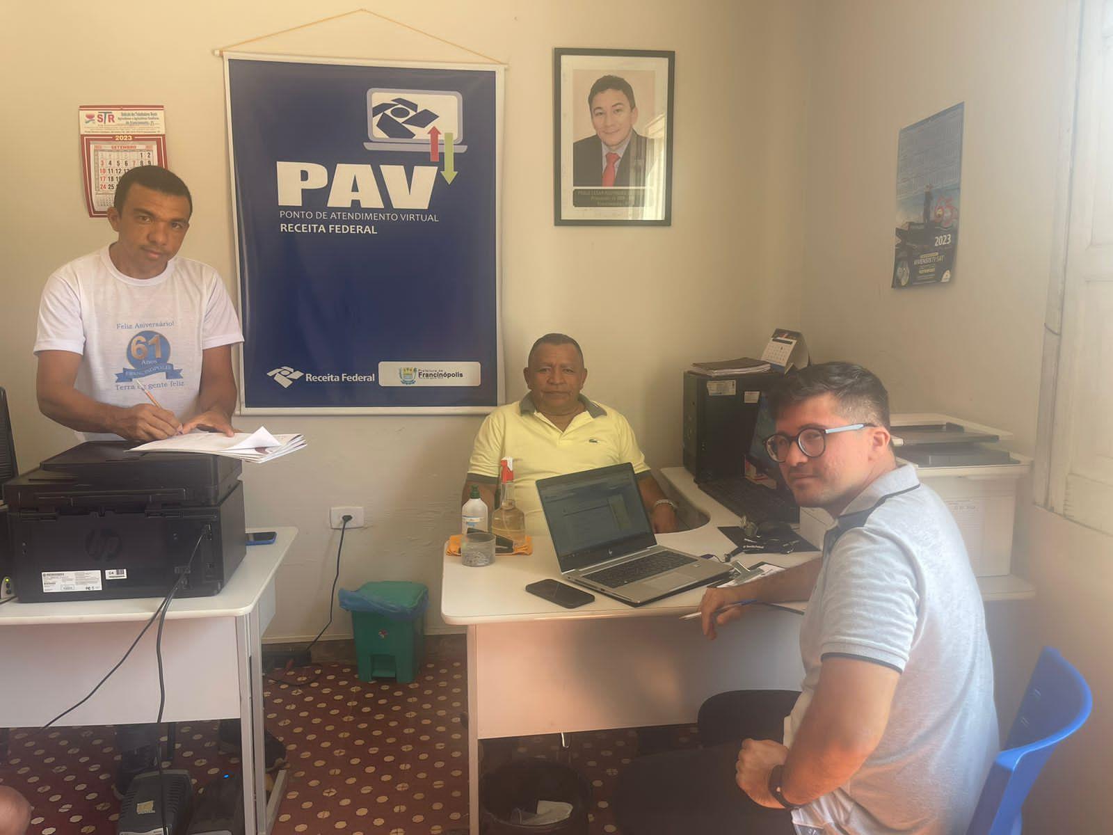 Nesta quinta-feira (21), os operadores do PAV de Francinópolis Décio Ferreira e Renê Morais, receberam a visita do coordenador geral dos PAVs da Receita Federal Renan Loiola Barros.