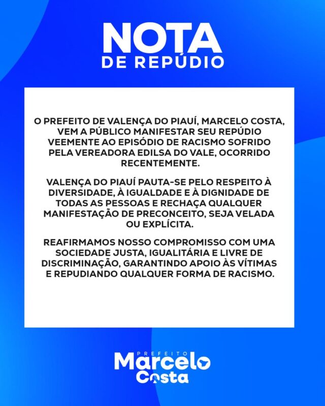 “O Prefeito de Valença do Piauí, Marcelo Costa, vem a público manifestar seu repúdio veemente ao episódio de racismo sofrido pela Vereadora Edilsa do Vale, ocorrido recentemente. Valença do Piauí pauta-se pelo respeito à diversidade, à igualdade e à dignidade de todas as pessoas e rechaça qualquer manifestação de preconceito, seja velada ou explícita” disse o prefeito que disse ainda.