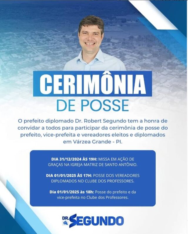 “Convido toda a população de Várzea Grande para a minha cerimônia de posse. Juntos, vamos continuar construindo uma cidade cada vez melhor” convidou nas redes sociais, o prefeito reeleito de Várzea Grande, Dr. Segundo que será empossado no dia 1º de janeiro durante sessão solene do Poder Legislativo Municipal.