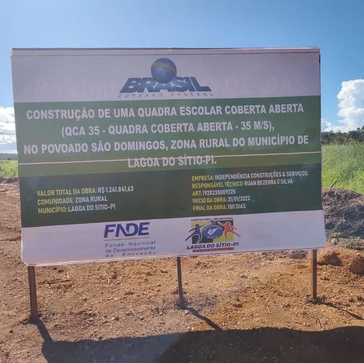 “Mais uma obra no Município de Lagoa do Sítio! Chegou à ordem de Serviço para Construção de uma Quadra Coberta Padrão FNDE no Povoado São Domingos! Obrigado meu Deputado Atila Filho e o Senador Ciro Nogueira pela parceria e compromisso com o Município de Lagoa do Sítio” escreveu o prefeito.