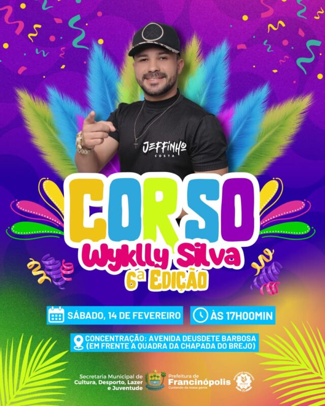 A Prefeitura Municipal de Francinópolis, por meio da Secretaria Municipal de Cultura, Desporto, Lazer e Juventude, vai promover a sexta edição do corso Wyklly Silva. O evento será realizado no sábado, dia 14 de fevereiro, a partir das 17h, com concentração na Avenida Deusdete Barbosa, em frente à quadra da Chapada do Brejo.