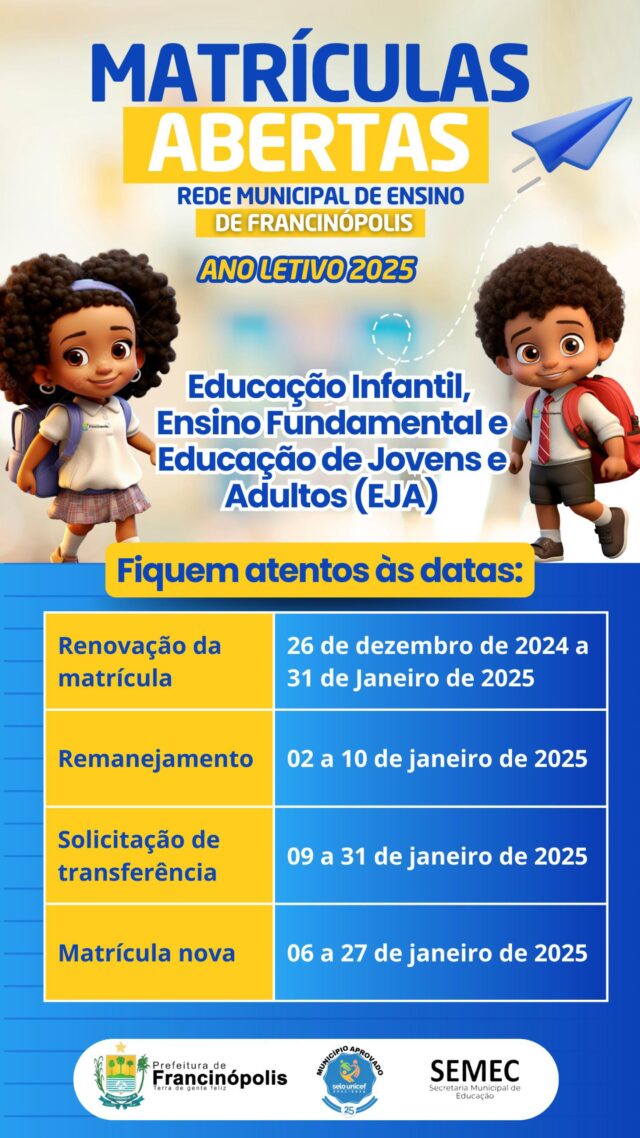 A Prefeitura de Francinópolis, por meio da Secretaria de Educação informa aos pais e responsáveis o calendário e as orientações para a renovação de matrículas na Rede Municipal de Ensino para o ano letivo de 2025.