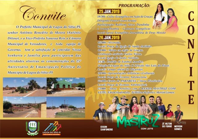 A Prefeitura de Lagoa do Sitio anunciou a programação oficial dos 25 anos de emancipação política do município que acontecerá nos dias 25 e 26 de janeiro.