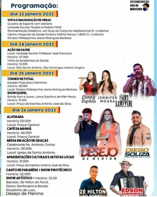 A Prefeitura de Lagoa do Sítio divulgou a programação dos 28 anos de emancipação política administrativa do município, que acontecerá de 23 a 26 de janeiro.