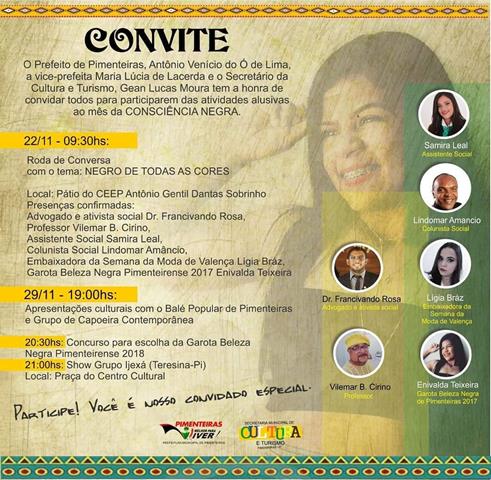 A Prefeitura Municipal de Pimenteiras, através do nosso Prefeito Venício do Ó, Vice-prefeita Lucia Lacerda e o Secretário de Cultura e Turismo Gean Lucas, tem a honra de convidar a todos para participarem das atividades alusivas ao dia da Consciência Negra.