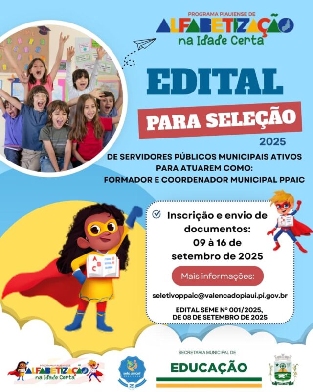 A Prefeitura de Valença do Piauí, por meio da Secretaria Municipal de Educação, tornou público o edital de seleção para servidores municipais ativos que desejam atuar como formador e coordenador municipal no âmbito do Programa Piauiense de Alfabetização na Idade Certa (PPAIC).