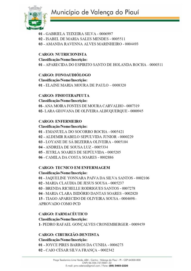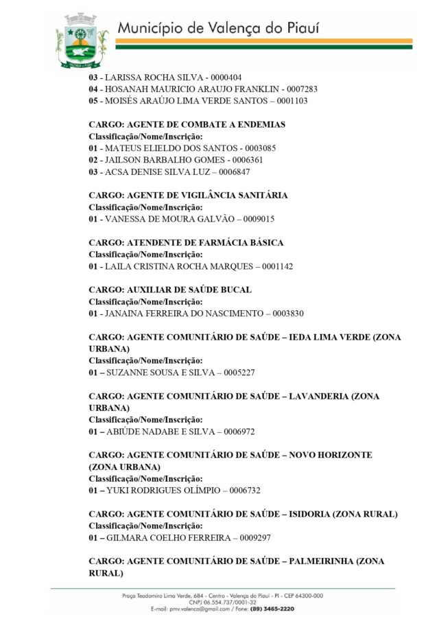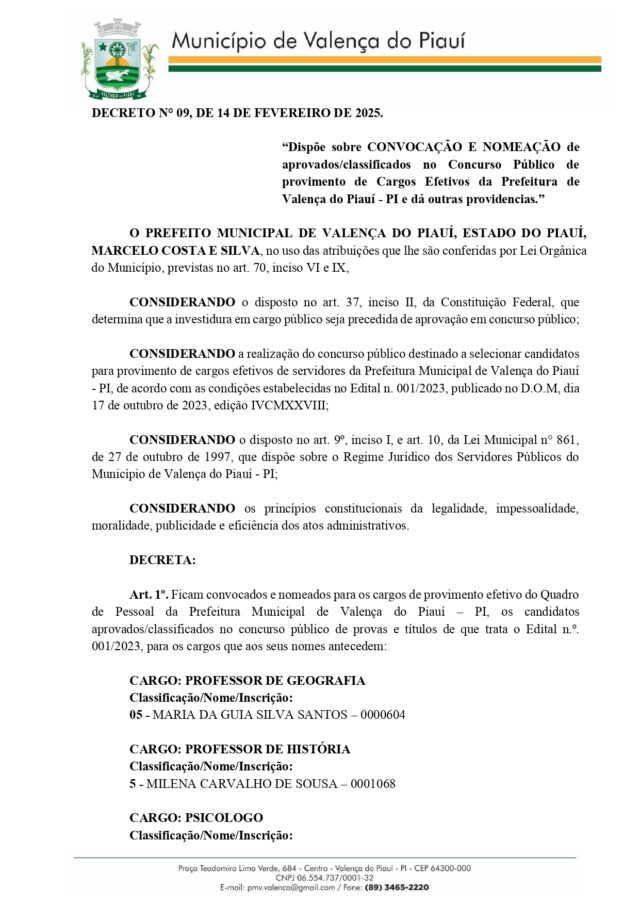 A Prefeitura Municipal de Valença do Piauí, por intermédio do Edital 09/2025, de 14 de fevereiro, está fazendo o chamamento de mais aprovados no Concurso Público Municipal para tomar posse nos cargos de professores, psicólogos, nutricionista, fonoaudiólogo, fisioterapeuta, enfermeiro, técnico em enfermagem, farmacêutico, cirurgião dentista, agente de combate a endemias e da vigilância sanitária, atendente de farmácia básica, auxiliar de saúde bucal, agente comunitário de saúde, motorista e monitor social.