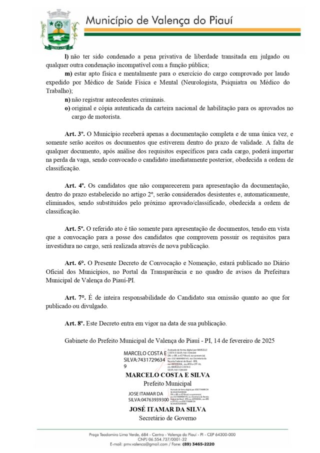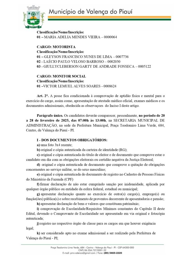 “Os candidatos deverão comparecer, pessoalmente, no período de 20 a 28 de fevereiro de 2025, das 07:00h às 13:00h, na SECRETARIA MUNICIPAL DE ADMINISTRAÇÃO, na sede da Prefeitura Municipal, Praça Teodomiro Lima Verde, 684,Centro, de Valença do Piauí e apresentar a documentação exigida no edital assinado pelo prefeito Marcelo Costa e pelo secretário de governo Dr. José Itamar.”