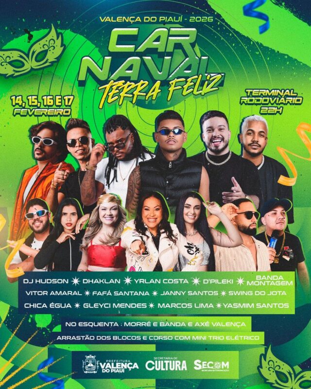 A Prefeitura de Valença do Piauí, por meio da Secretaria Municipal de Cultura e Turismo, divulgou oficialmente a programação do Carnaval 2026. A cidade, que mantém a tradição de celebrar o período carnavalesco, contará com uma série de atividades entre os dias 14 e 17 de fevereiro, oferecendo opções de lazer para públicos diversos.