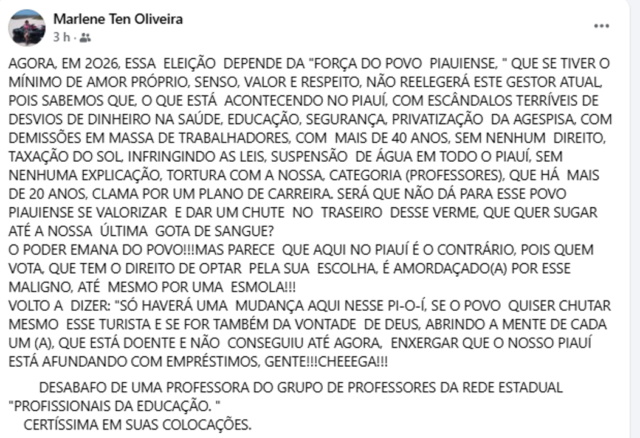 Na publicação, a educadora afirmou que acredita que as eleições de 2026 dependerão da mobilização da população piauiense e defendeu que os eleitores reflitam sobre a escolha dos governantes. Ela citou denúncias de desvios de recursos na saúde, educação e segurança, além da privatização da Agespisa, demissões de trabalhadores e problemas no abastecimento de água.