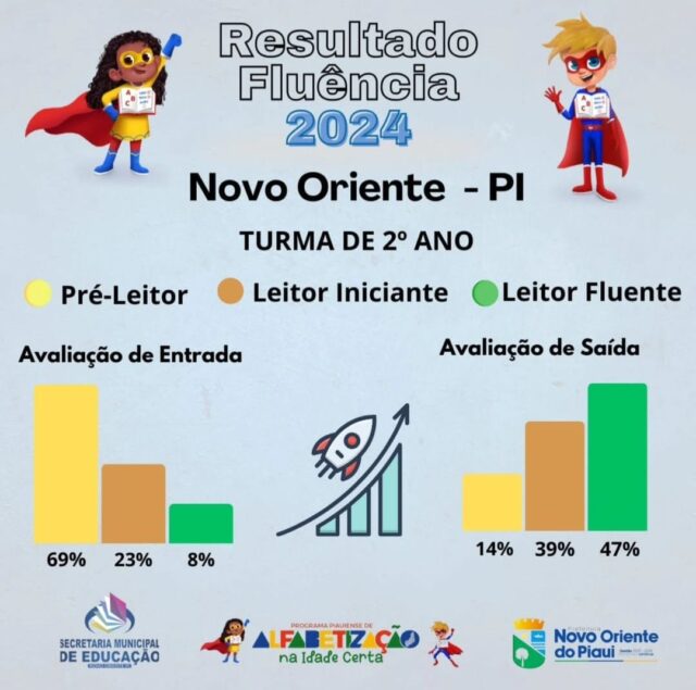 O município de Novo Oriente do Piauí também avançou significativamente nos resultados da Avaliação de Fluência leitora dos alunos do 2° ano do Ensino Fundamental I no ano de 2024, aumentando o número de estudantes leitores iniciantes e fluentes. Veja desempenho.