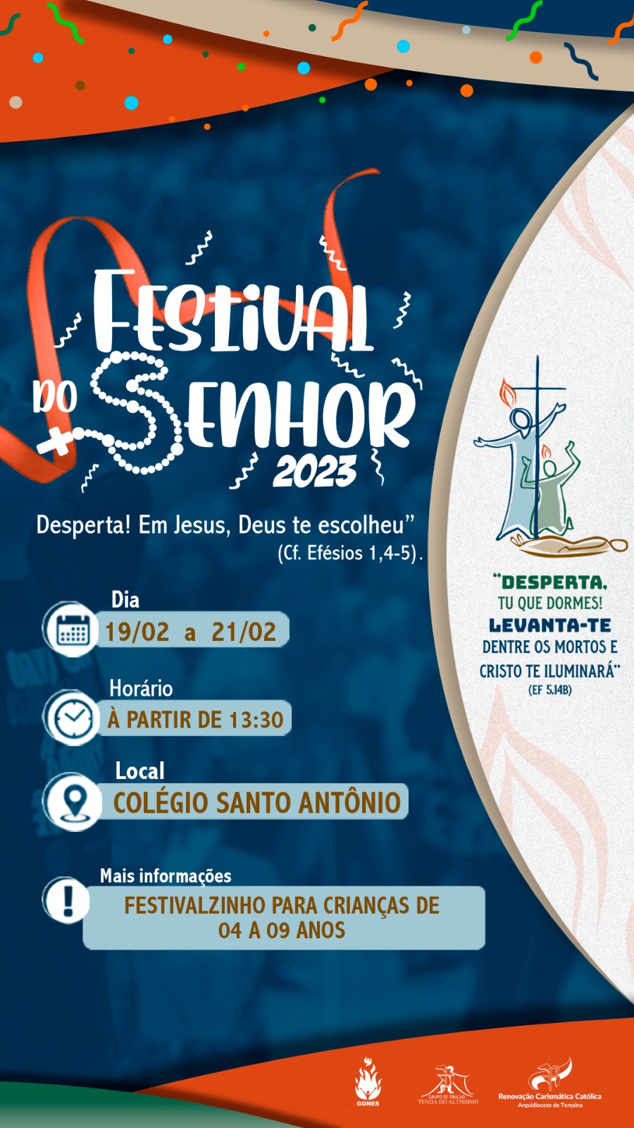 Os grupos de Oração das Paróquias de Nossa Senhora do Ó e Conceição e São Francisco de Assis, divulgaram a programação para o Festival do Senhor. A festividade católica que acontece durante o carnaval e já é uma tradição em Valença do Piauí será realizada nos dias 19, 20 e 21 de fevereiro, no Colégio Santo Antônio.