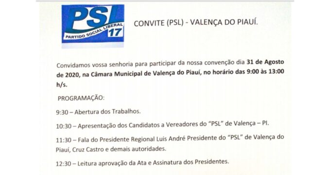 O Partido Social Liberal (PSL) de Valença do Piauí marcou para o próximo dia 31 de agosto, na Câmara Municipal, a convenção que homologará os nomes do partido para as eleições de novembro. O partido apresentará nomes para o Legislativo Municipal e oficializará o apoio ao pré-candidato a prefeito, Marcelo Costa, do Progressistas.