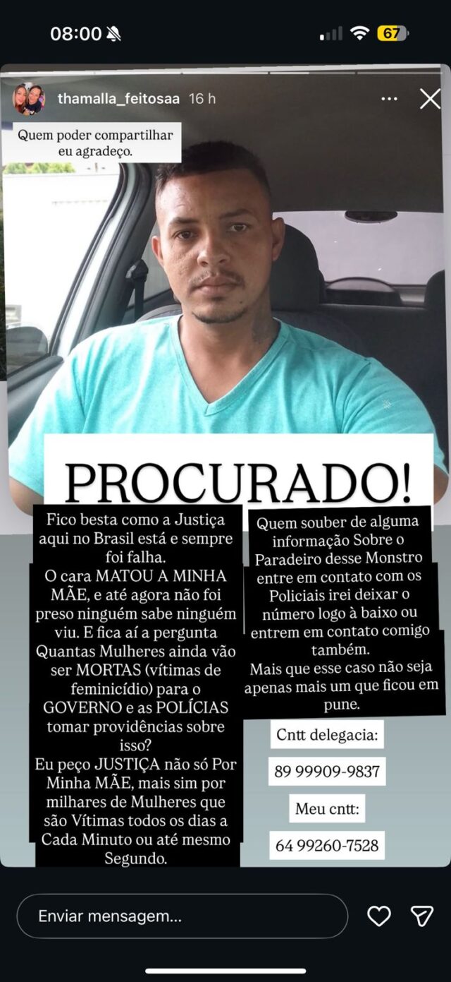 “O cara matou a minha mãe e até agora não foi preso. Ninguém sabe, ninguém viu. Quantas mulheres ainda vão ser mortas para o governo e as polícias tomarem providências?”, escreveu, ao pedir justiça não apenas por sua mãe, mas por milhares de mulheres vítimas da violência diariamente.
