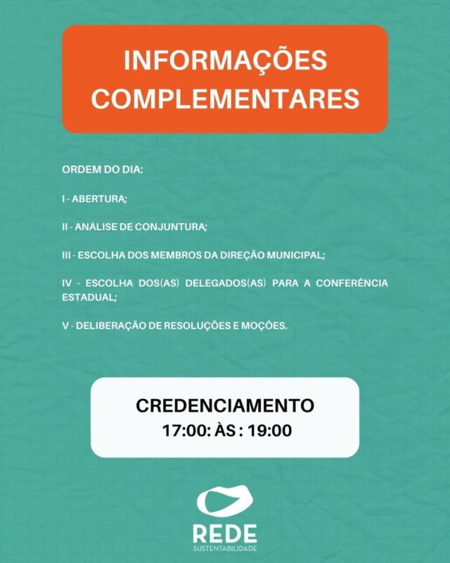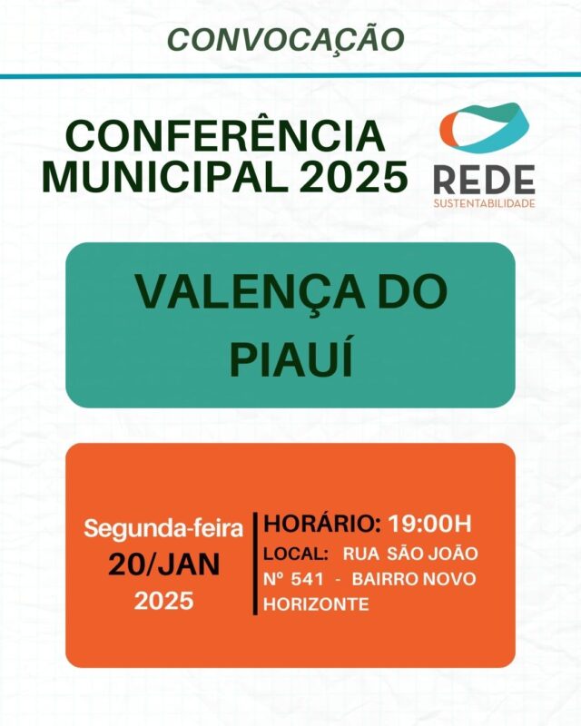 O Partido Rede Sustentabilidade de Valença do Piauí realiza no próximo dia 20 de janeiro sua conferência municipal no bairro Novo Horizonte a partir das 19h. Entre as pautas que serão debatidas está a analise da conjuntura politica municipal, escolha da nova direção do partido e escolha dos delegados para a conferência estadual da sigla, entre outras pautas.