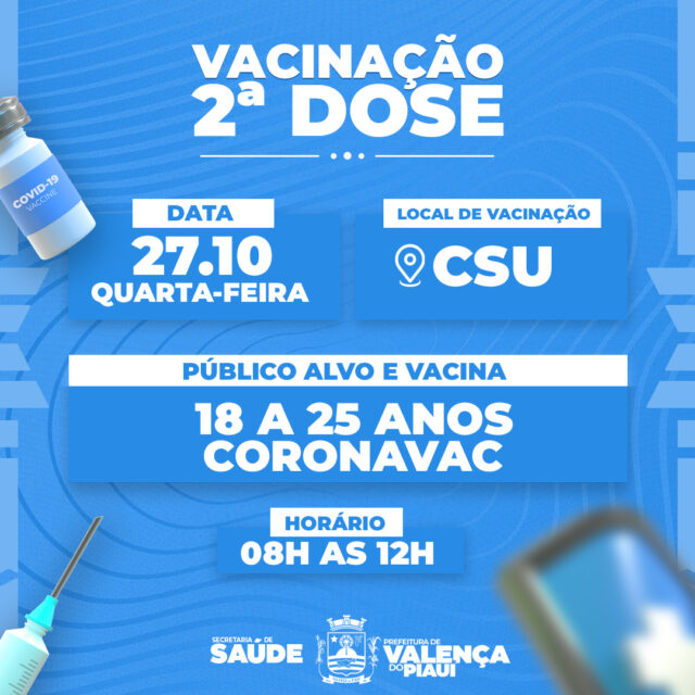 Na quarta-feira, 27 de outubro, será aplicada a segunda dose da Coronavac no público de 18 a 25 anos de idade.