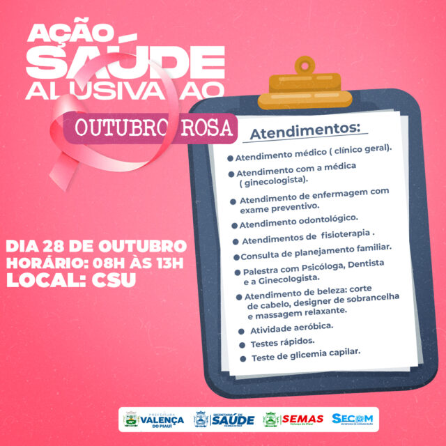 Na quinta-feira (28), a Saúde de Valença realiza uma Ação em Saúde alusiva ao Outubro Rosa com a realização de uma série de atividades, como: Atendimento médico e com ginecologista, exames preventivos, atendimento odontológico, atendimento de fisioterapia, consulta de planejamento familiar, palestras, atendimento de beleza com corte de cabelos, designer de sobrancelhas e massagem relaxante, atividade aeróbica, testes rápidos e glicemia capilar.