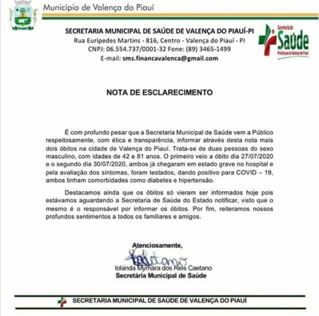 A Secretaria de Saúde de Valença do Piauí confirmou na noite desta sexta-feira, dia 31 de julho, mais duas mortes causadas pelo novo coronavírus. De acordo com a Nota de Esclarecimento, as vítimas são duas pessoas do sexo masculino com idades de 42 e 81 anos.
